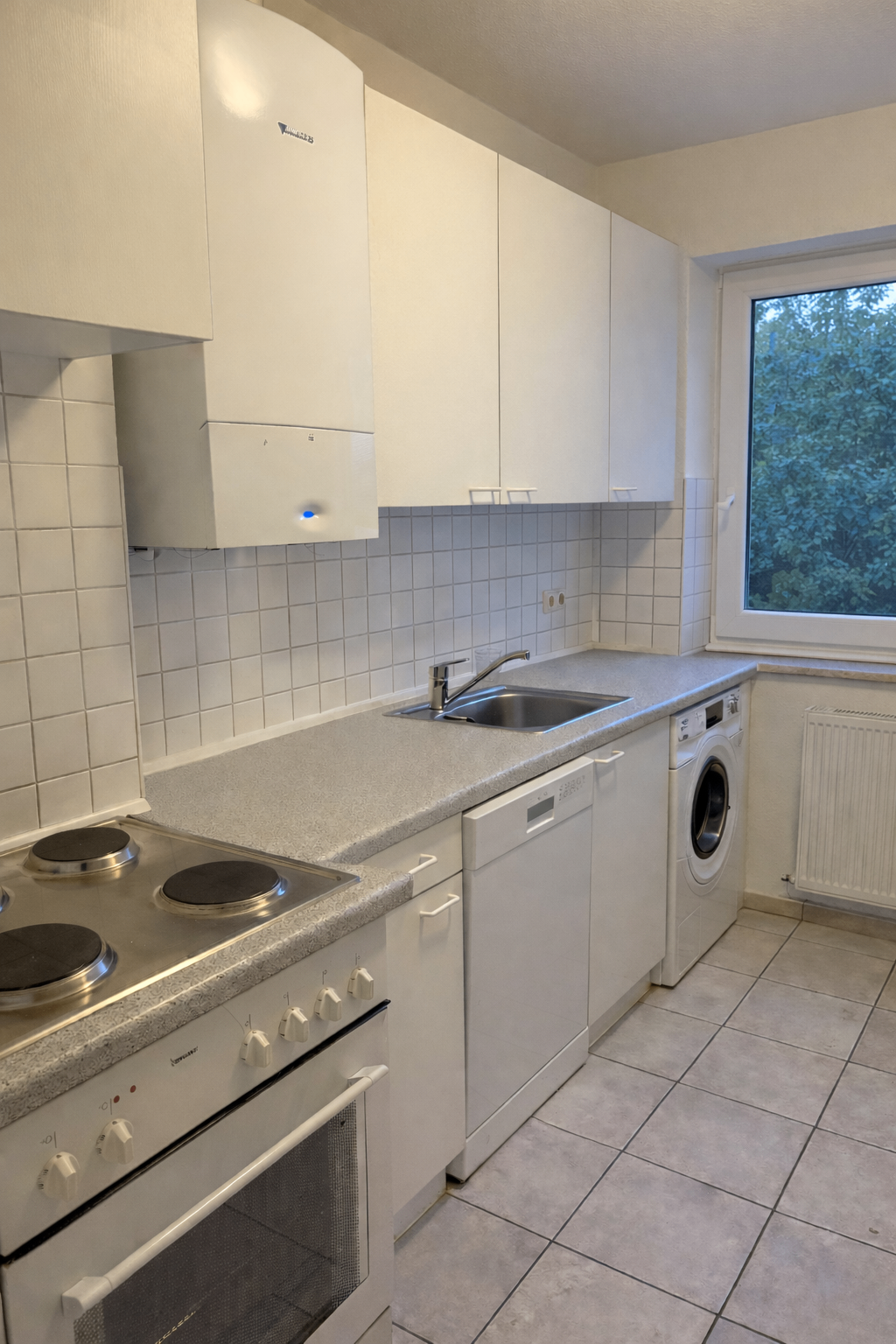 Die vorhandene Einbauküche verfügt über einen Anschluss für Waschmaschine und Geschirrspüler und bietet damit eine praktische Grundlage für Ihren Alltag.