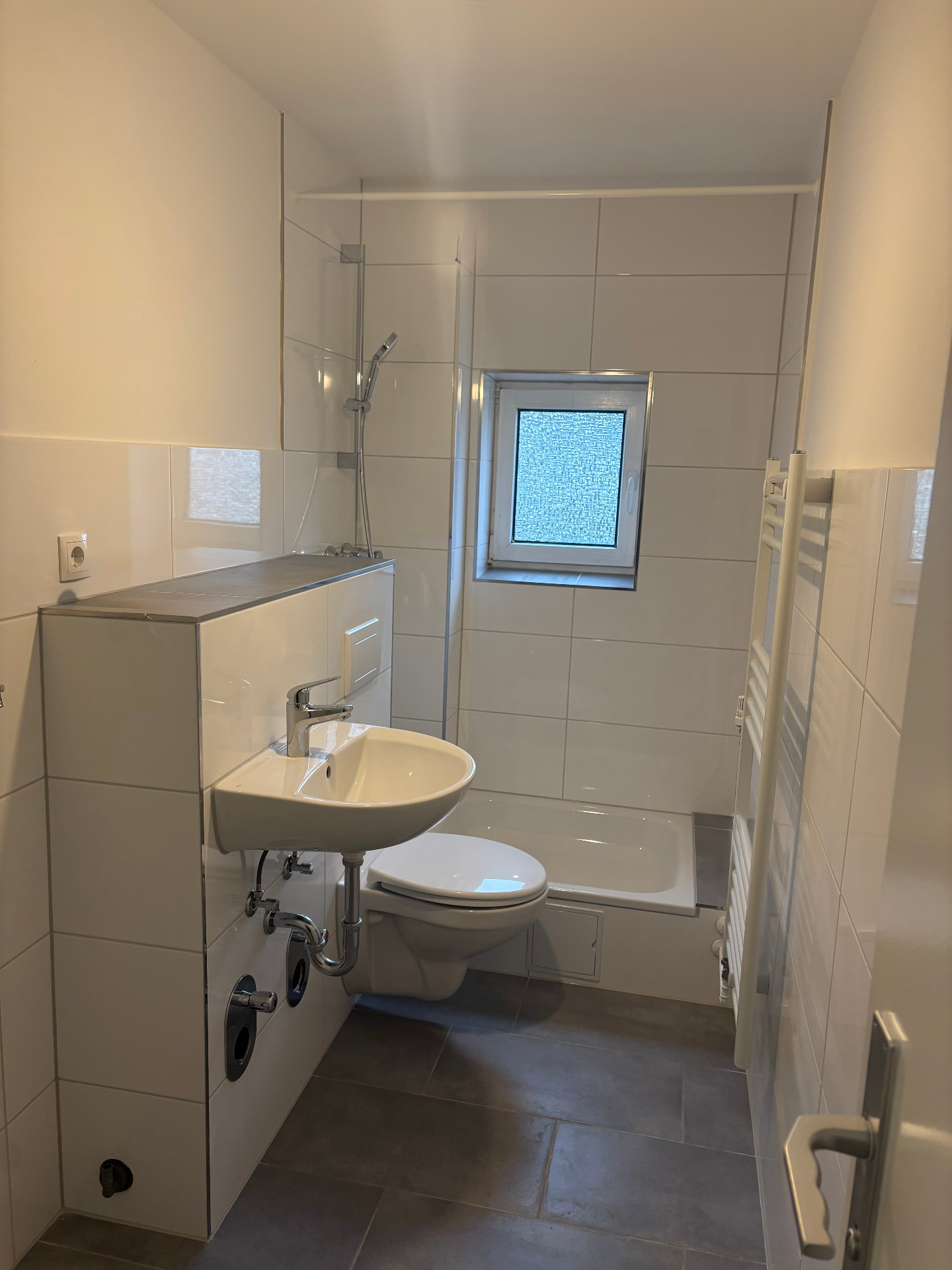 Das komplett erneuerte Badezimmer bietet mit einer Dusche und einem Waschmaschinenanschluss zusätzlichen Alltagskomfort.