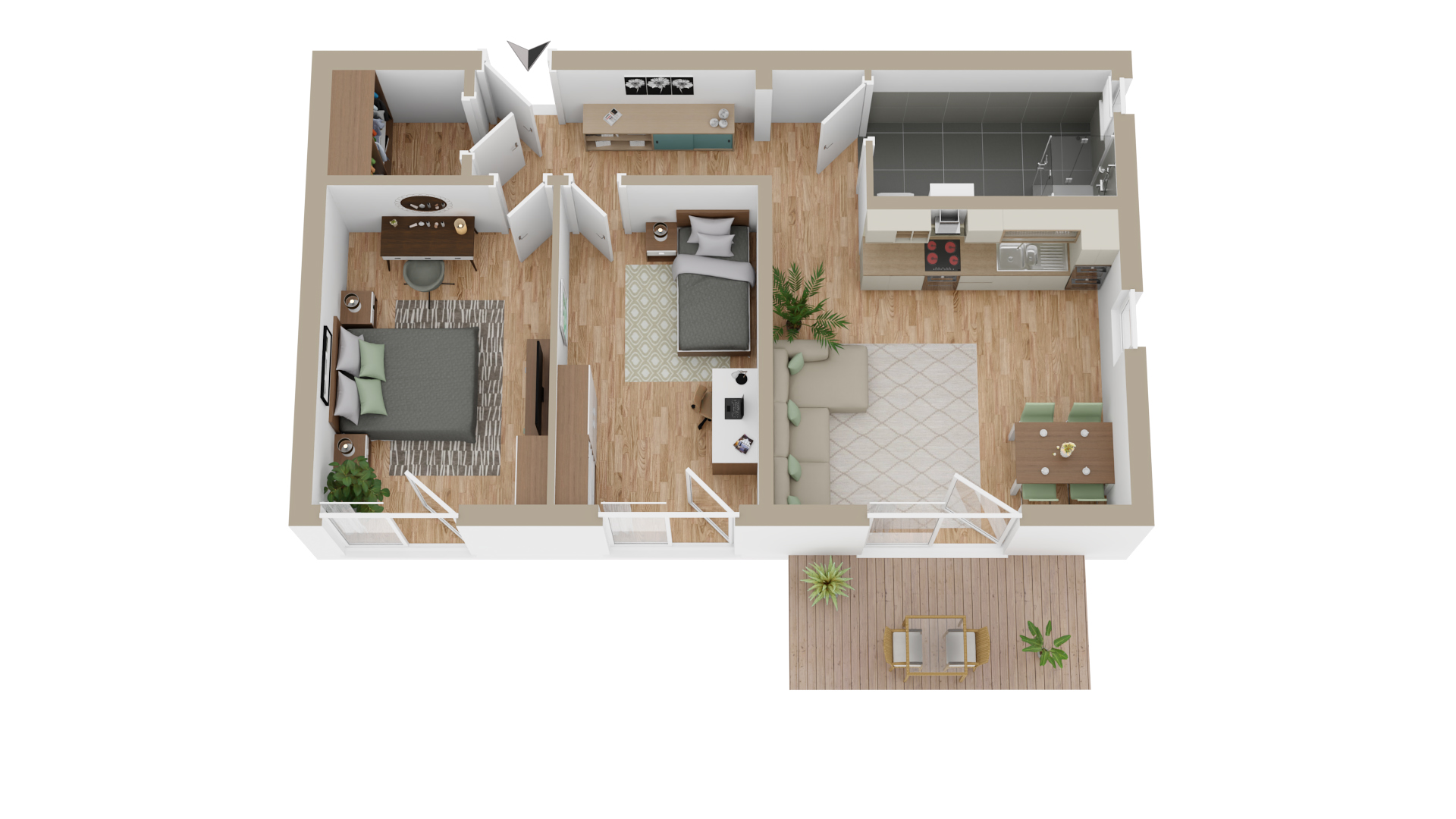 Die Wohnung verfügt über zwei Schlafzimmer, ein großzügiges Hauptschlafzimmer sowie ein weiteres, etwas kleineres Zimmer, das sich ideal als Kinder-, Gäste- oder Arbeitszimmer eignet. Beide Zimmer sind mit bodentiefen Fenstern ausgestattet und sorgen für eine helle und freundliche Wohnatmosphäre.