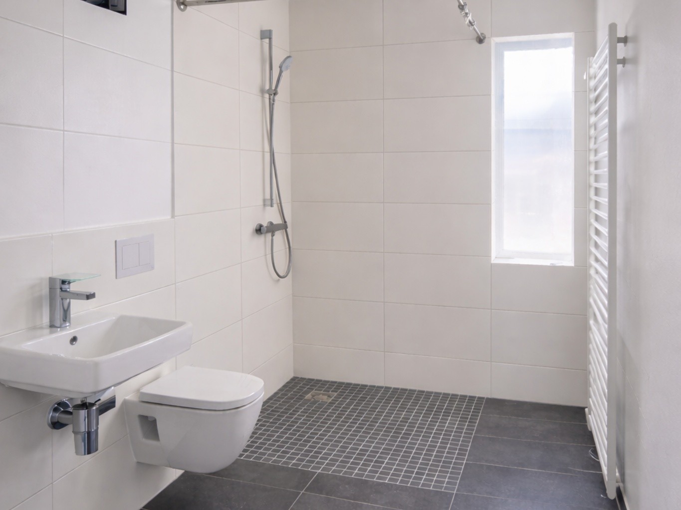 Das Tageslichtbad verfügt über eine barrierearmen Dusche mit einer Glasduschabtrennung, einen Waschmaschinenanschluss sowie einen Handtuchheizkörper. Weiße Wandfliesen und anthrazitfarbene, matte Bodenfliesen verleihen dem Badezimmer eine moderne und zeitlose Gestaltung. Zusätzlich bietet ein praktischer Abstellraum innerhalb der Wohnung Stauraum.