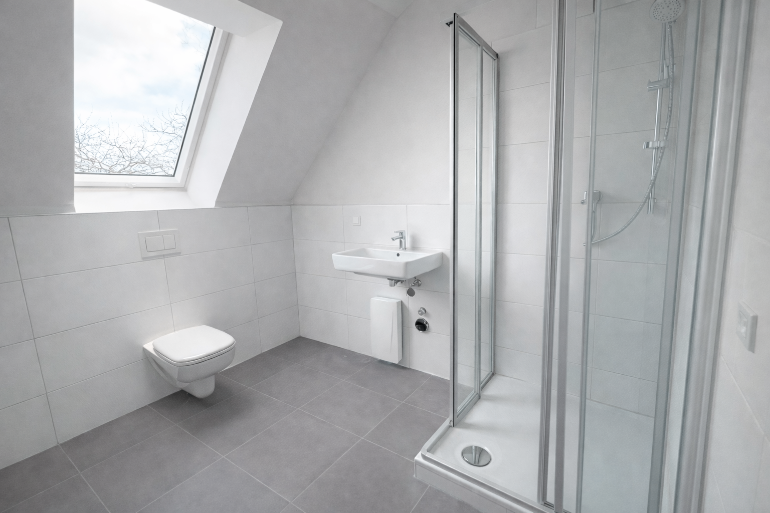 Das modern gestaltete Badezimmer überzeugt mit stilvollen grauen Bodenfliesen, einem Dachfenster für angenehmes Tageslicht und Belüftung sowie einer eleganten Dusche mit Schiebetüren.