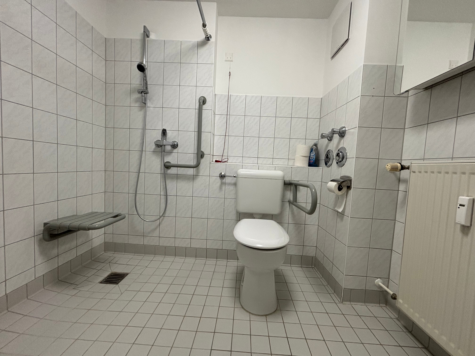 Das barrierefreie Badezimmer mit Dusche überzeugt durch eine praktische und komfortable Gestaltung, die Sicherheit und Bewegungsfreiheit in den Mittelpunkt stellt. Ein Fahrstuhl im Haus sorgt für eine bequeme Erreichbarkeit aller Etagen, und ein eigener Kellerraum bietet zusätzlichen Stauraum für mehr Ordnung im Alltag.