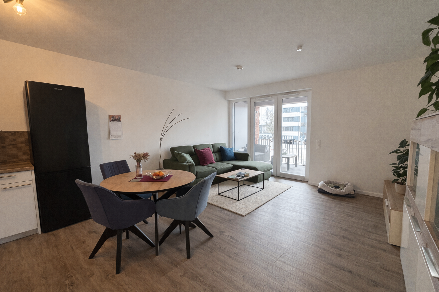 Der Wohnbereich schafft eine angenehme Wohlfühlatmosphäre und bietet direkten Zugang zum Balkon. Hier lässt sich der Alltag wunderbar hinter sich lassen – ob bei einem entspannten Frühstück am Morgen oder einem ruhigen Abend an der frischen Luft.