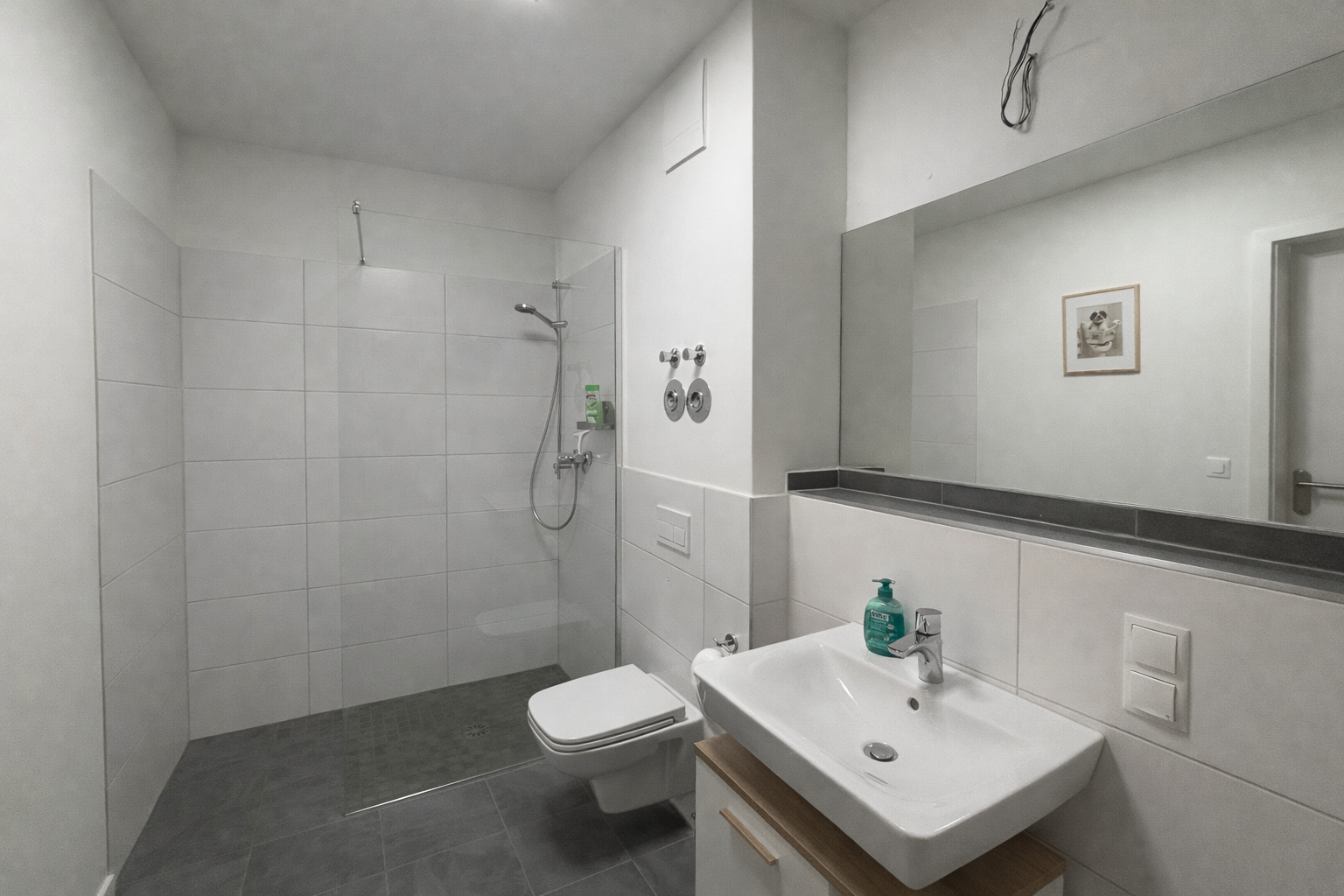 Das modern gestaltete Badezimmer ist mit einer Dusche und eleganter Glastrennwand ausgestattet. Ein Waschmaschinenanschluss im Bad sorgt zusätzlich für praktischen Komfort und kurze Wege im Alltag.