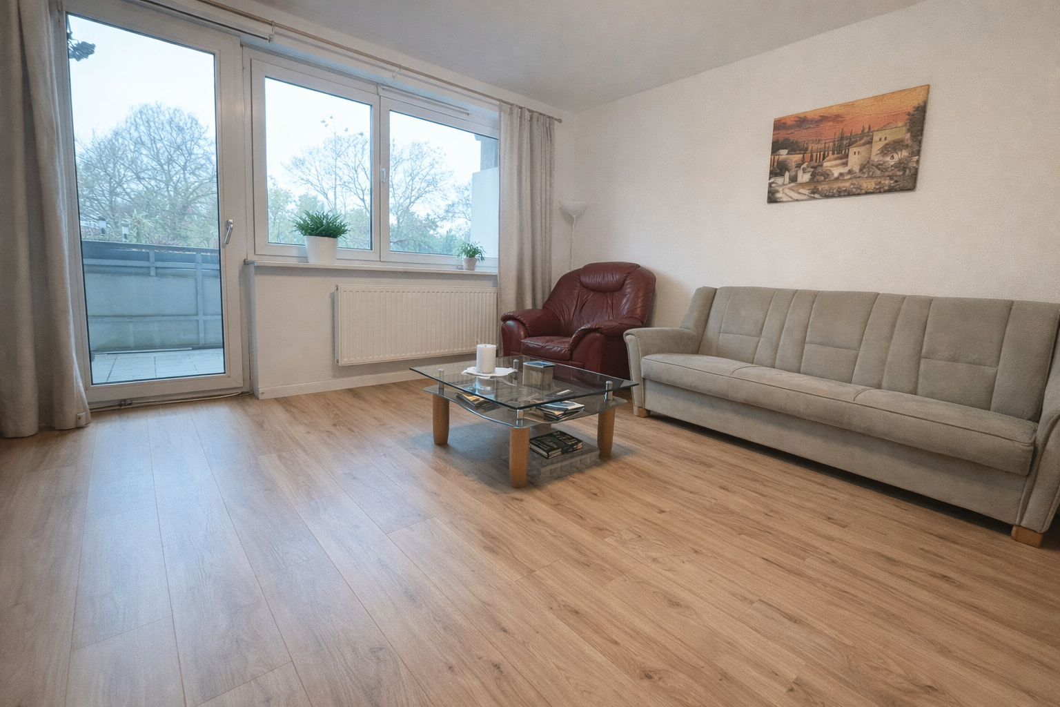 Das geräumige Wohnzimmer bildet das Herzstück der Wohnung und bietet direkten Zugang zum Balkon – ideal für entspannte Stunden im Freien.