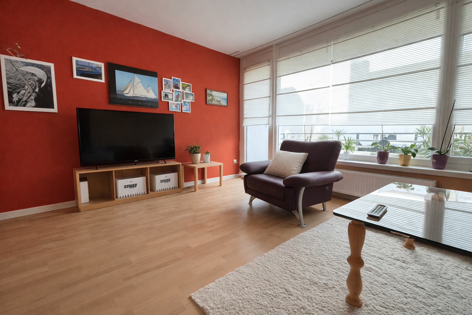 Das helle und großzügige Wohnzimmer bildet den Mittelpunkt der Wohnung. Große Fensterflächen sorgen für viel Tageslicht und schaffen eine offene, freundliche Stimmung. Von hier aus gelangen Sie direkt auf den Balkon, der den Wohnraum nach draußen erweitert und zum Abschalten, Durchatmen oder gemütlichen Feierabendmomenten einlädt.