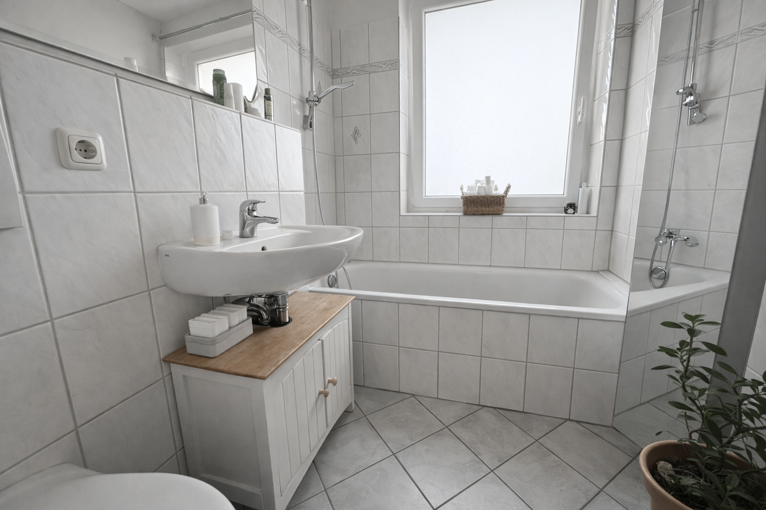 Das Badezimmer präsentiert sich hell und freundlich, dank Fenster mit Tageslicht und frischer Luft. Die Badewanne sorgt für entspannte Momente nach einem langen Tag und macht das Bad zu einem kleinen Wohlfühlort.
